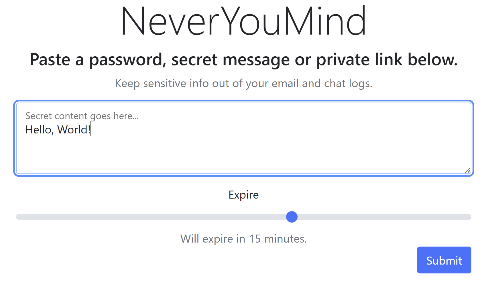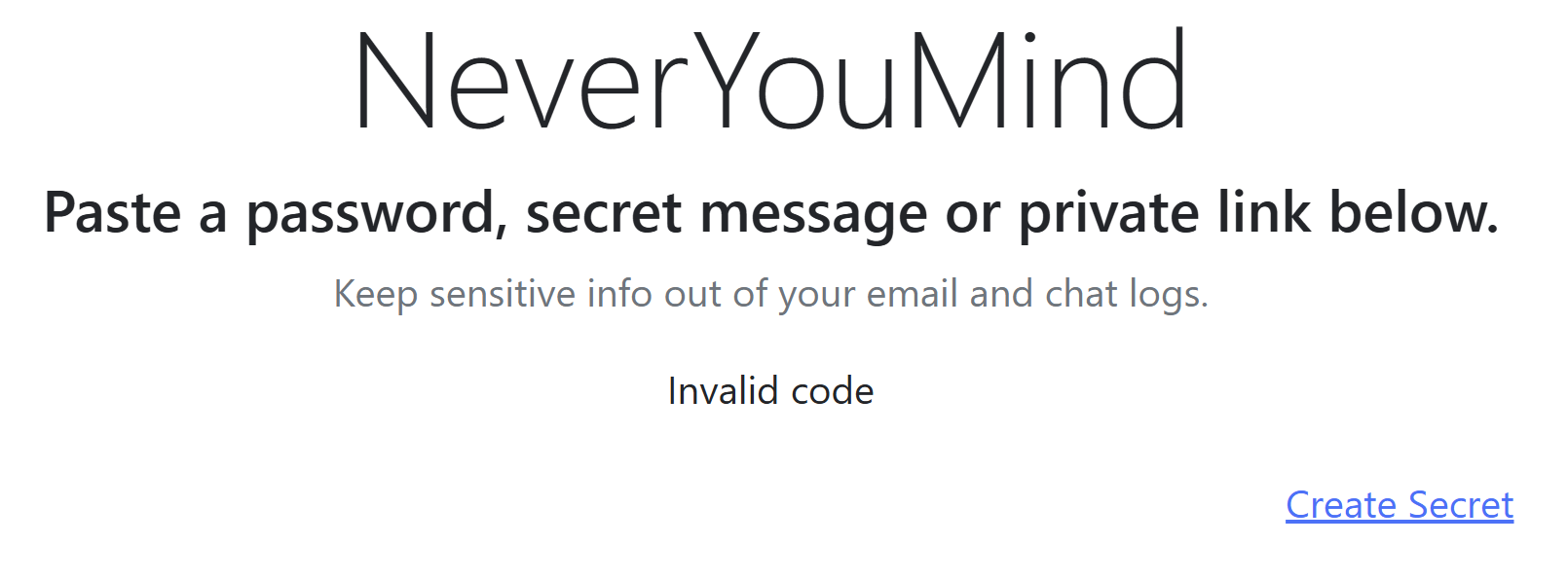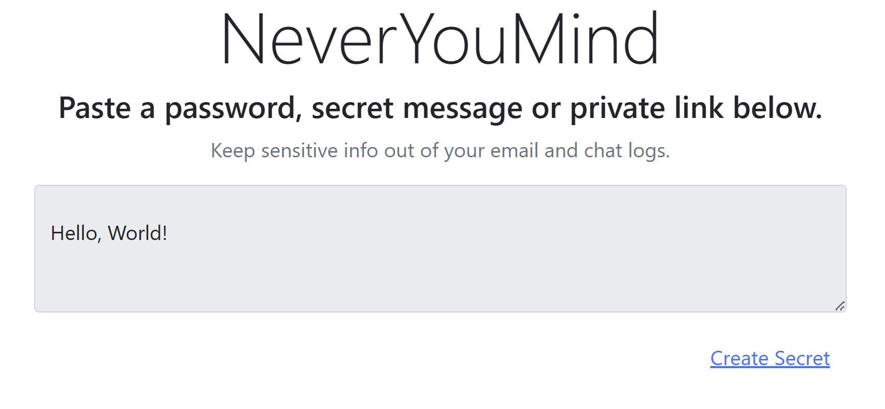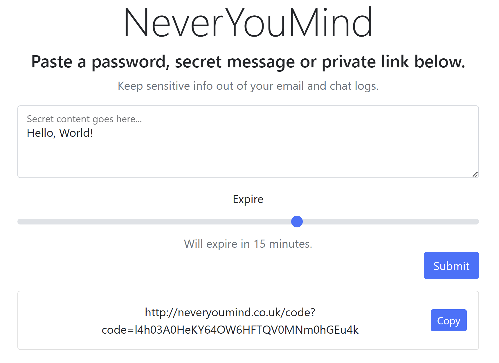 This is pretty much a Onetime Secret, I brought the domains neveryoumind.co.uk and never-you-mind.co.uk as a joke and honestly had no idea what to do with them. I was using Onetime Secret at the time and thought it would be funny to clone it with the domain names.